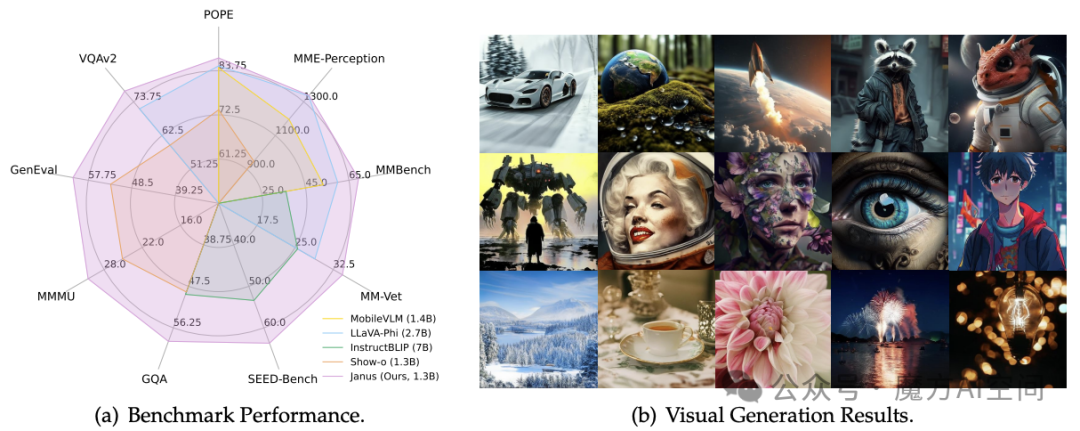 图1 | Janus实现了多模态理解与视觉生成。Janus的表现优于现有的最先进统一多模态模型以及一些特定任务的多模态理解模型,同时也展现了强大的视觉生成能力。图像分辨率为384x384。