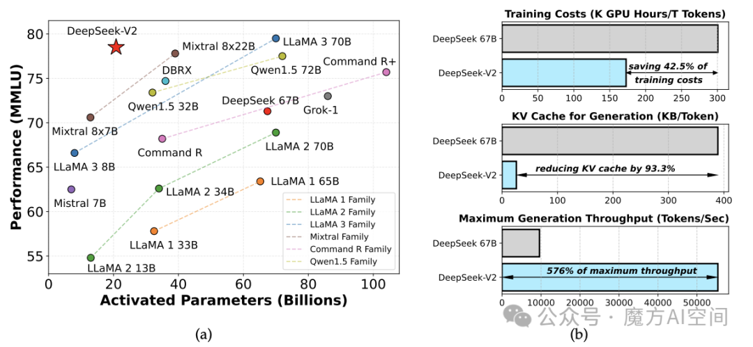 图1|(a) 不同开源模型下多模态语言模型(MMLU)准确率与激活参数的关系。(b) DeepSeek 67B(密集型)和DeepSeek-V2的训练成本与推理效率。