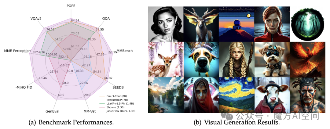 图1 | 使用JanusFlow进行多模态理解和图像生成。JanusFlow在视觉理解基准测试中超越了最先进的统一多模态模型和几种特定任务理解模型。它还能够生成高质量的图像。图像分辨率为384×384像素。