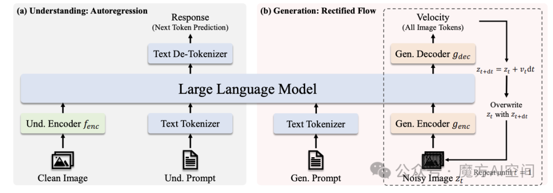 图2 | 提出的JanusFlow架构。为了便于视觉理解,大语言模型(LLM)执行自回归的下一个词元预测来生成响应。对于图像生成,LLM使用具有校正流(rectified flow)的图像。从*t*=0时刻的高斯噪声开始,LLM通过预测速度向量迭代更新*zt*,直到达到*t*=1时刻。为简化起见,省略了变分自编码器(VAE)编码器、在生成过程中使用的跳跃连接(skip connection)以及*f*enc后的线性层。