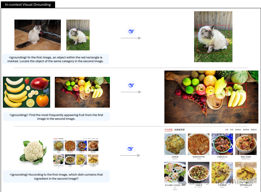 图10 | 使用DeepSeek-VL2进行上下文视觉定位。给定一张图片,无论是否有视觉提示,DeepSeek-VL2都能在另一张图片中找到相关物体。