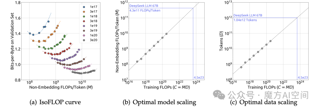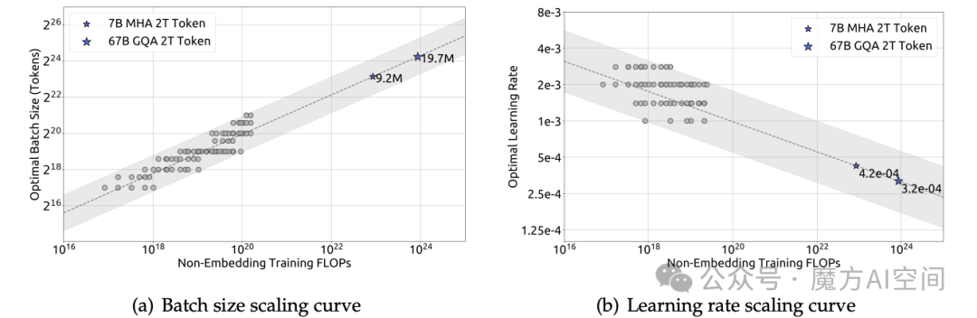 图3 | 批量大小和学习率的缩放曲线。灰色圆圈代表泛化误差超过最小值不超过0.25%的模型。虚线代表拟合较小模型的幂律。蓝色星号代表DeepSeek LLM 7B和67B