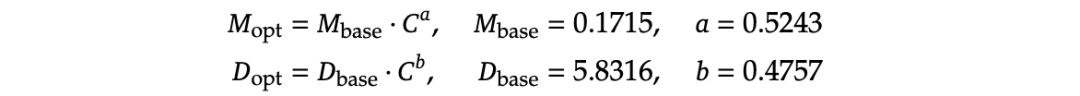 **缩放定律:**通过实验建模了计算预算C与最佳批量大小和学习率之间的幂律关系,公式如下: