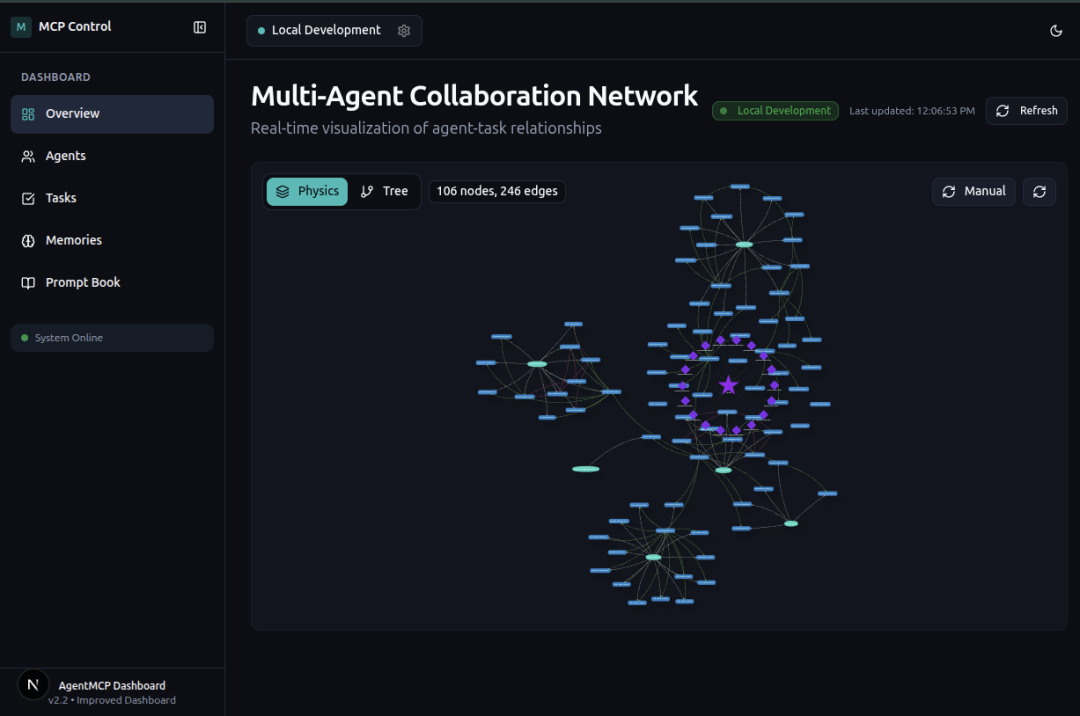 实时可视化展示了您的 AI 团队的工作情况——紫色节点代表上下文条目,蓝色节点是智能体,连接则显示了活跃的合作。这就像为您的开发团队配备了一个任务控制中心。