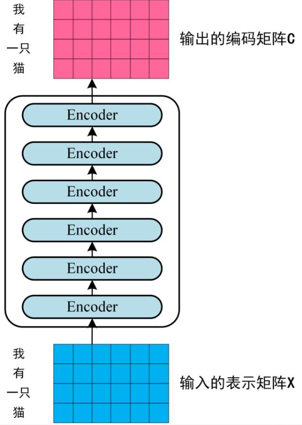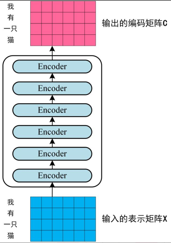 第二步:将形成的单词表示向量矩阵(如图示,每行对应一个单词的表示x)输入至Encoder,经过6个Encoder模块处理后,输出包含句子全部单词编码信息的矩阵C。