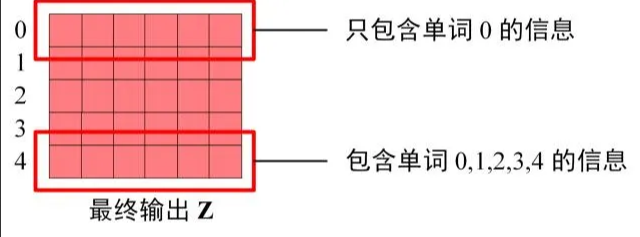 通过观察Mask矩阵可见,单词0仅能访问自身信息(位置0),单词1可访问位置0和1的信息,该约束机制确保模型只能使用当前位置之前的上下文信息。