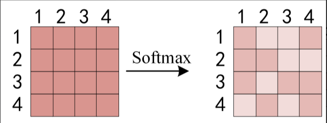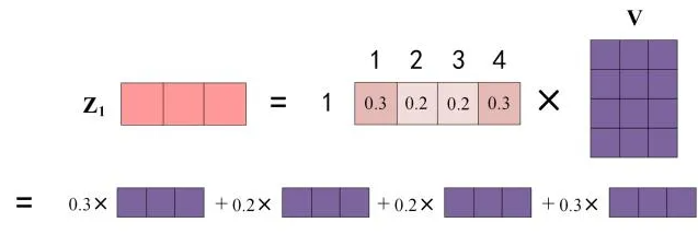 上图中 softmax 矩阵的第1行表示单词1 与其他所有单词的 attention 系数,最终单词1的输出 2,等于所有单词i的值 V: 根据 attention 系数的比例加在一起得到,如下图所示: