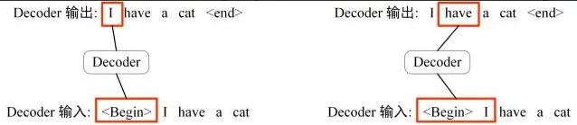 Decoder 可以在训练的过程中使用 Teacher Forcing 并且并行化训练,即将正确的单词序列(I have a cat)和对应输出(I have a cat)传递到 Decoder。