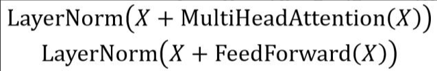 其中X代表Multi-Head Attention或Feed Forward的输入,MultiHeadAttention(X)与FeedForward(X)作为输出(由于输出与输入X维度相同,二者可直接相加)。