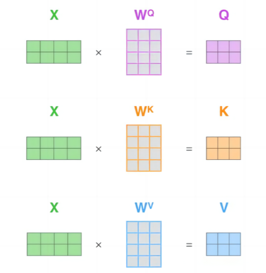 Self-Attention 的输入用矩阵X进行表示,则可以使用线性变阵矩阵WQ,WK,WV计算得到Q,K,V。