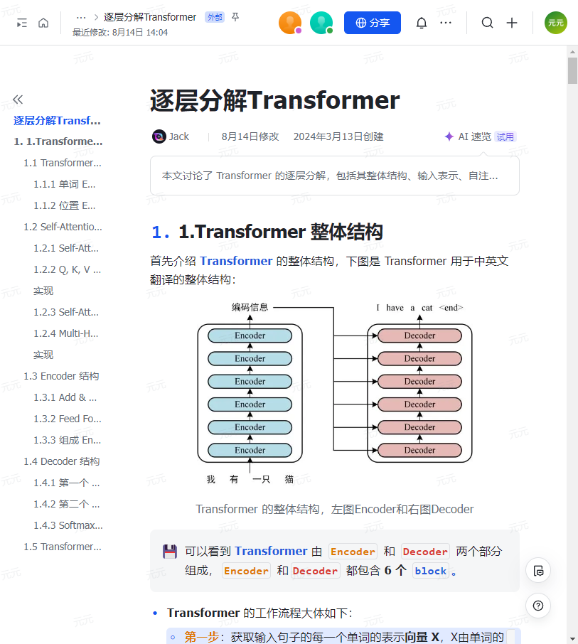 首先介绍 Transformer 的整体结构,下图是 Tansformer 用于中英文翻译的整体结构: