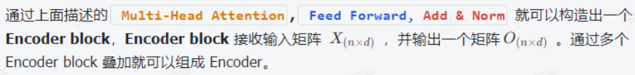 第一个 Encoder block的输入为句子单词的表示向量矩阵