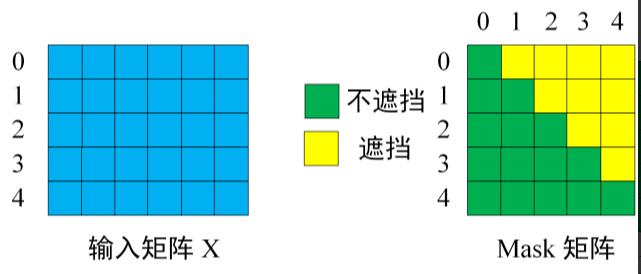 1)这里展示的是Decoder的输入矩阵与Mask矩阵结构。输入矩阵由序列’I have a cat’的五个单词(0,1,2,3,4)的向量表示组成,对应一个5×5的Mask矩阵。