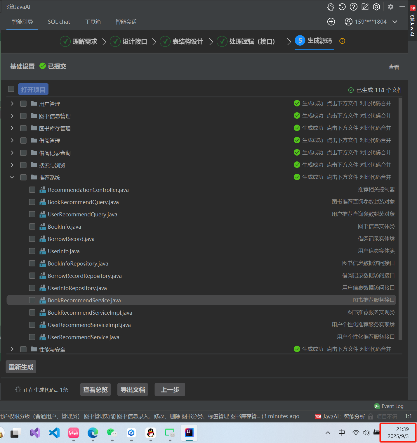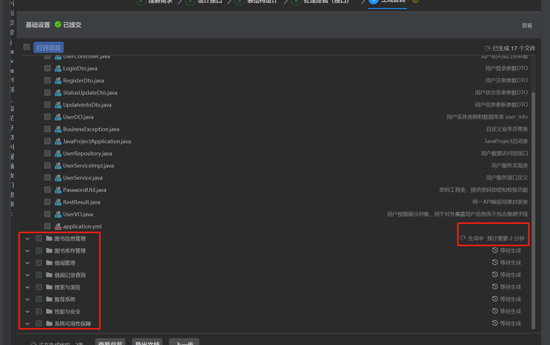 每一个子文件生成的时间大概是2min,最终完整生成代码时间是15min左右,速度还是可以的