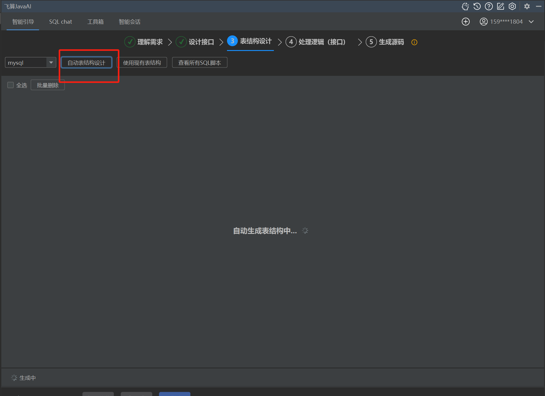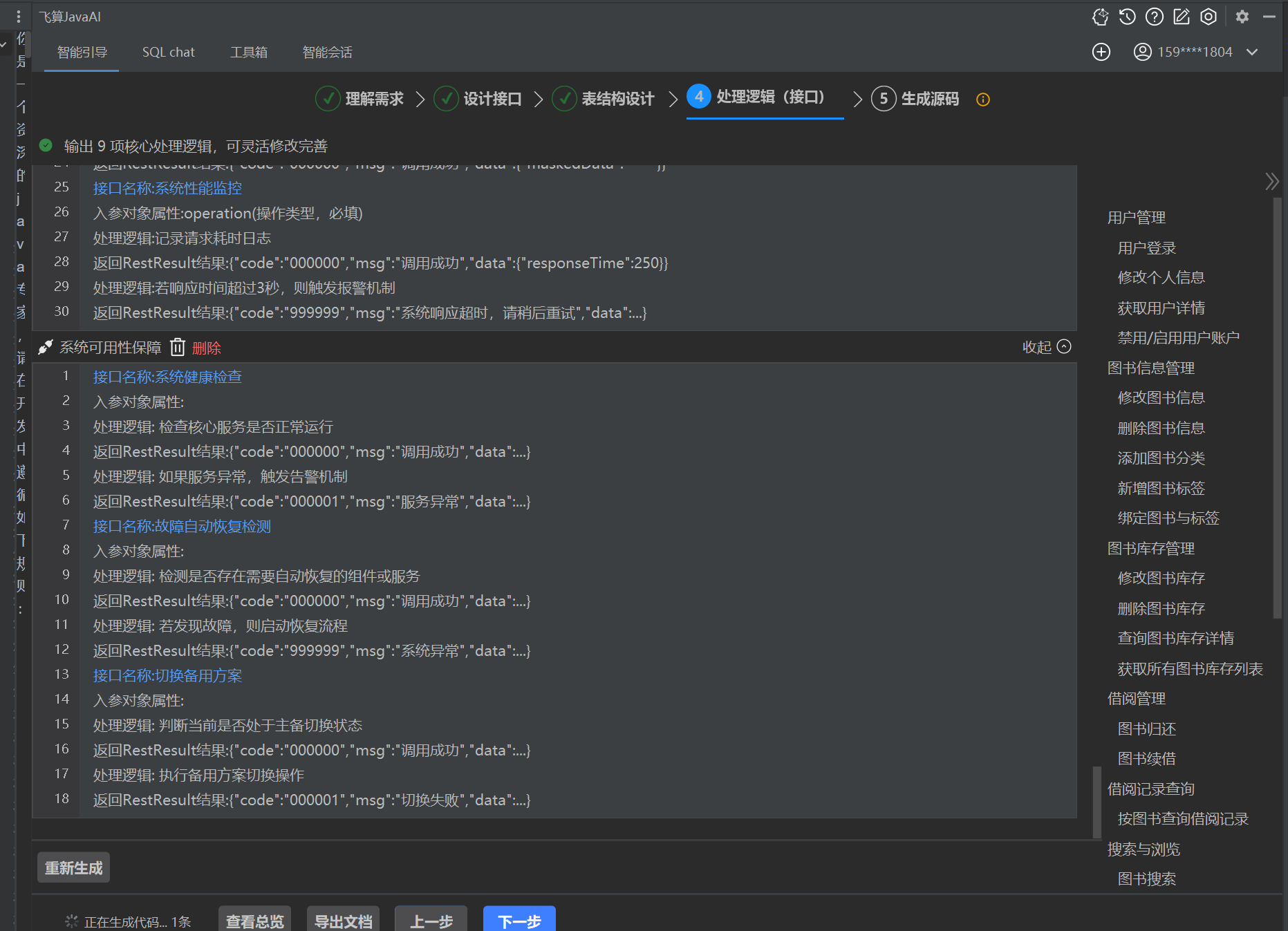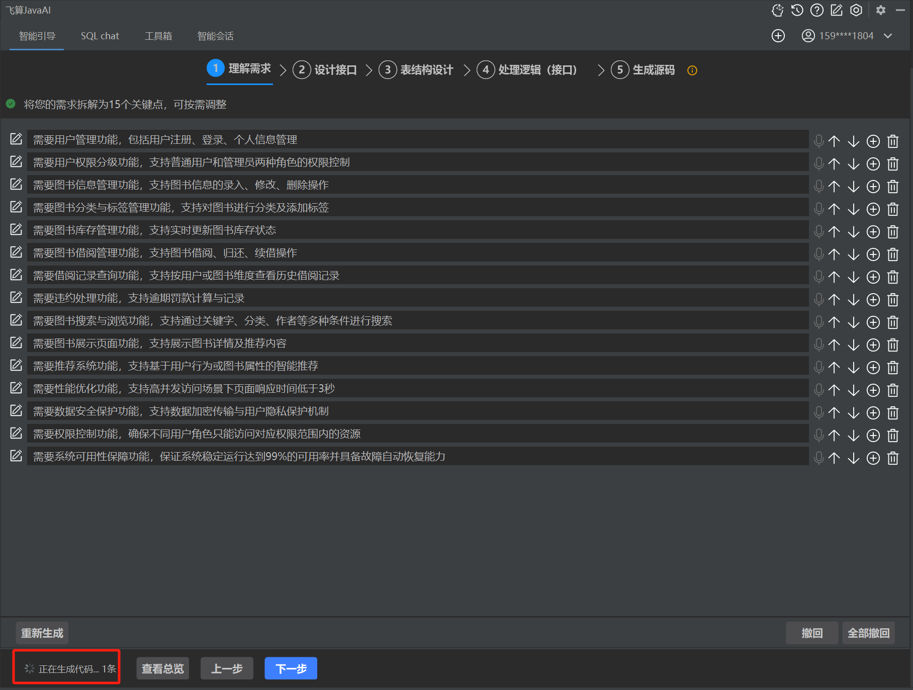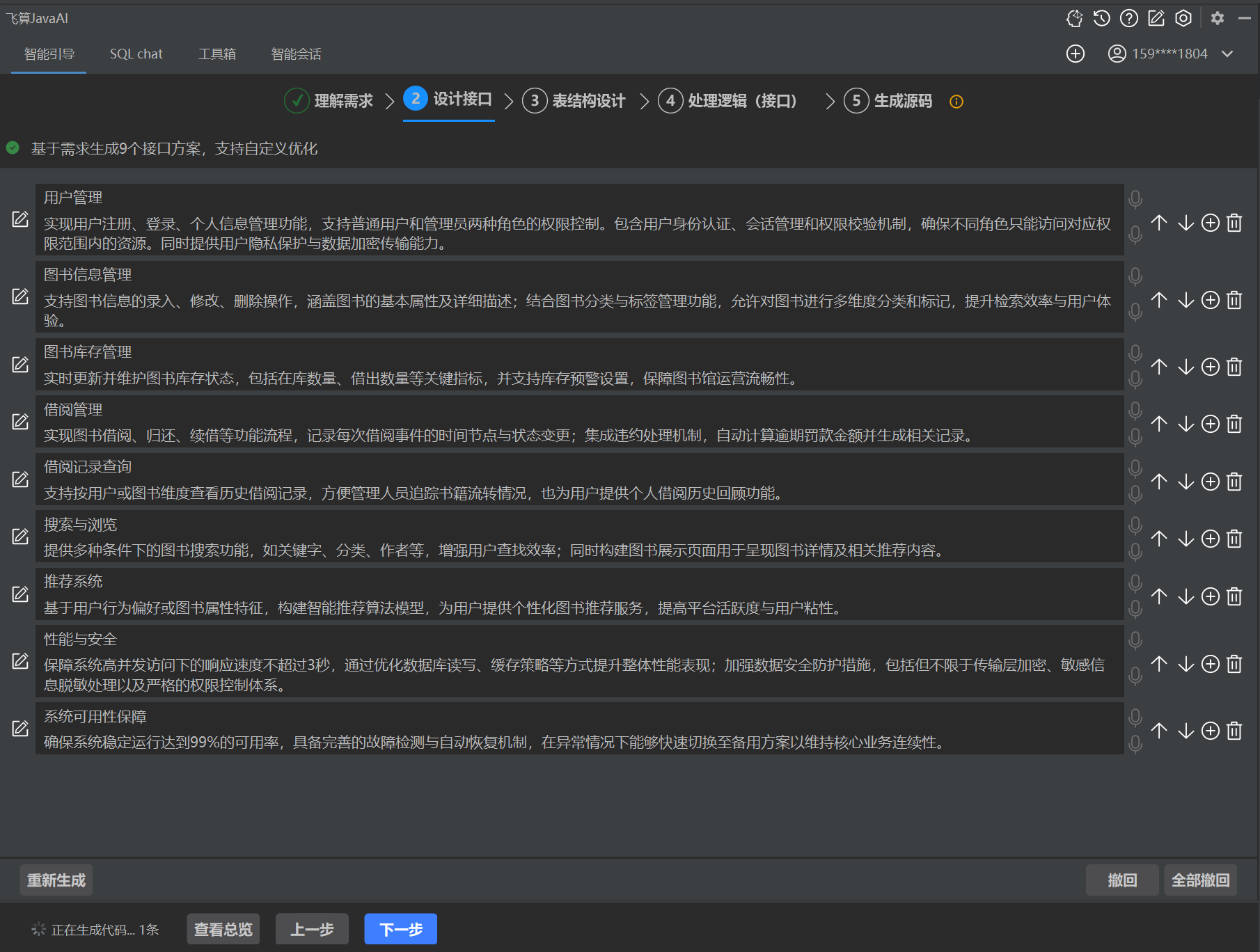 下面会有5个细分的步骤:理解需求、设计接口、表结构设计、处理逻辑(接口),最后是生成源码。其中前面4个都是我们可以人为去修改需求和接口的,以求最终生成的项目更加符合预期。