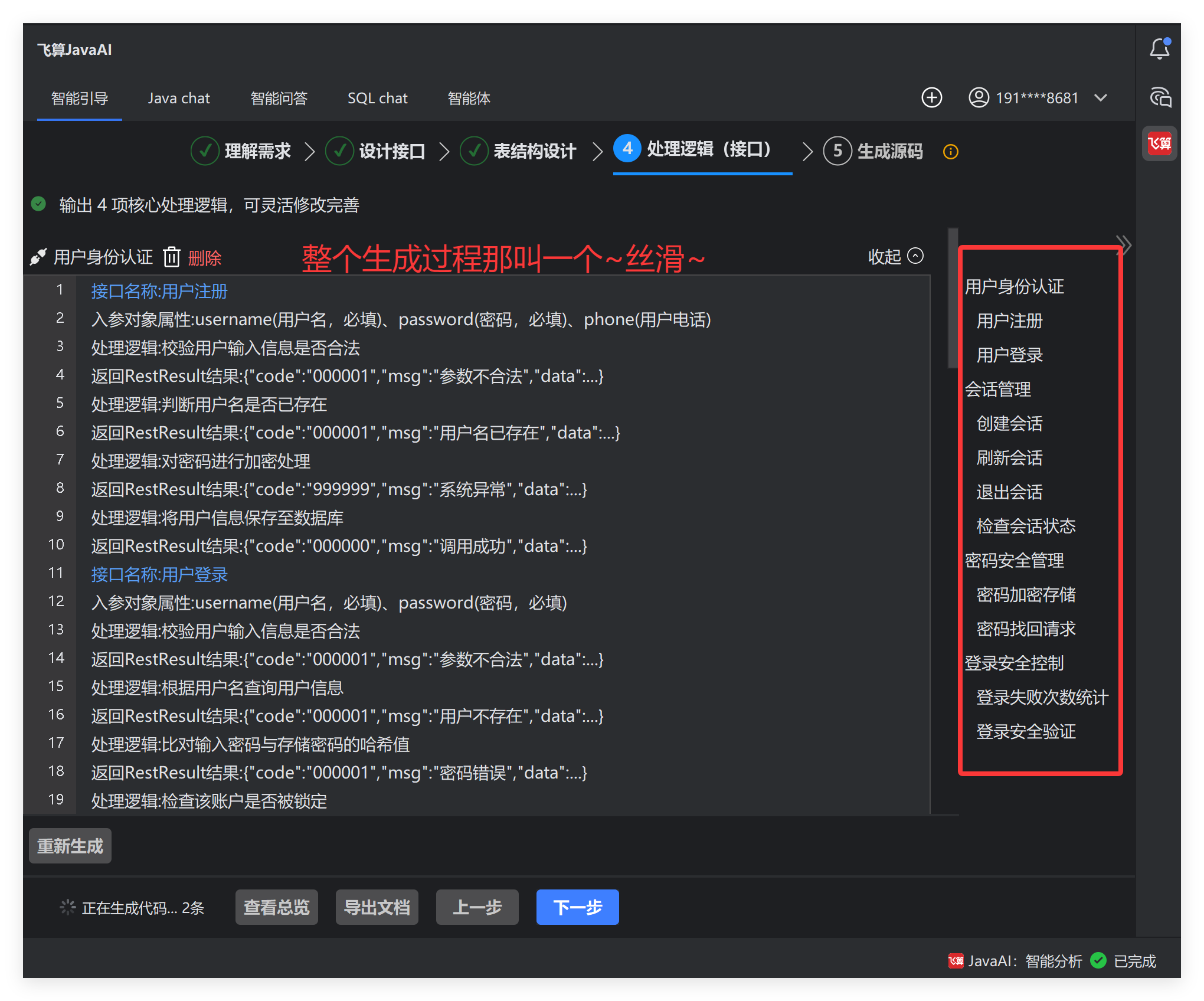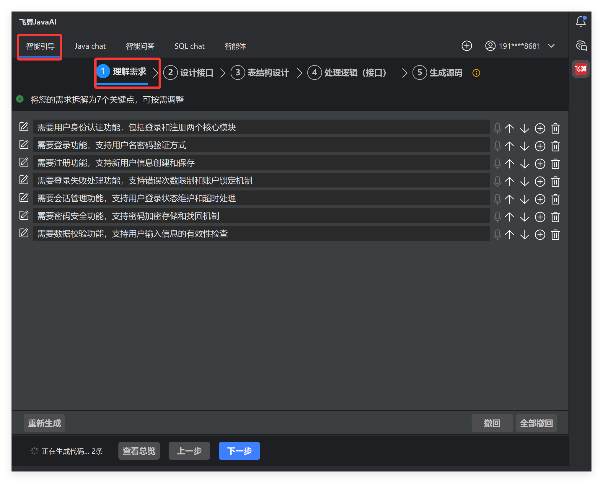 飞算JavaAI开始理解我们的需求,将我们的需求拆解成7个关键点,同时我们还可按需调整
