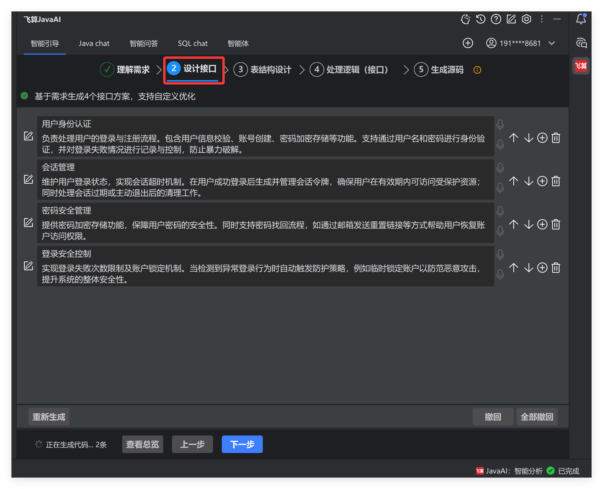 体验过程步骤清晰明了,我们点击下一步——设计接口,生成的速度非常快
