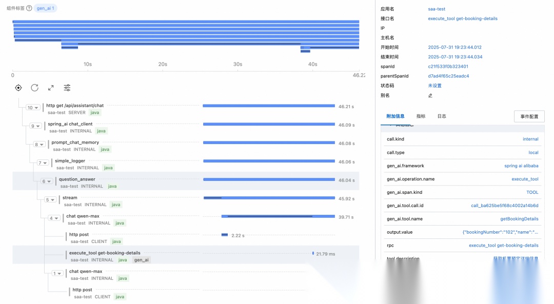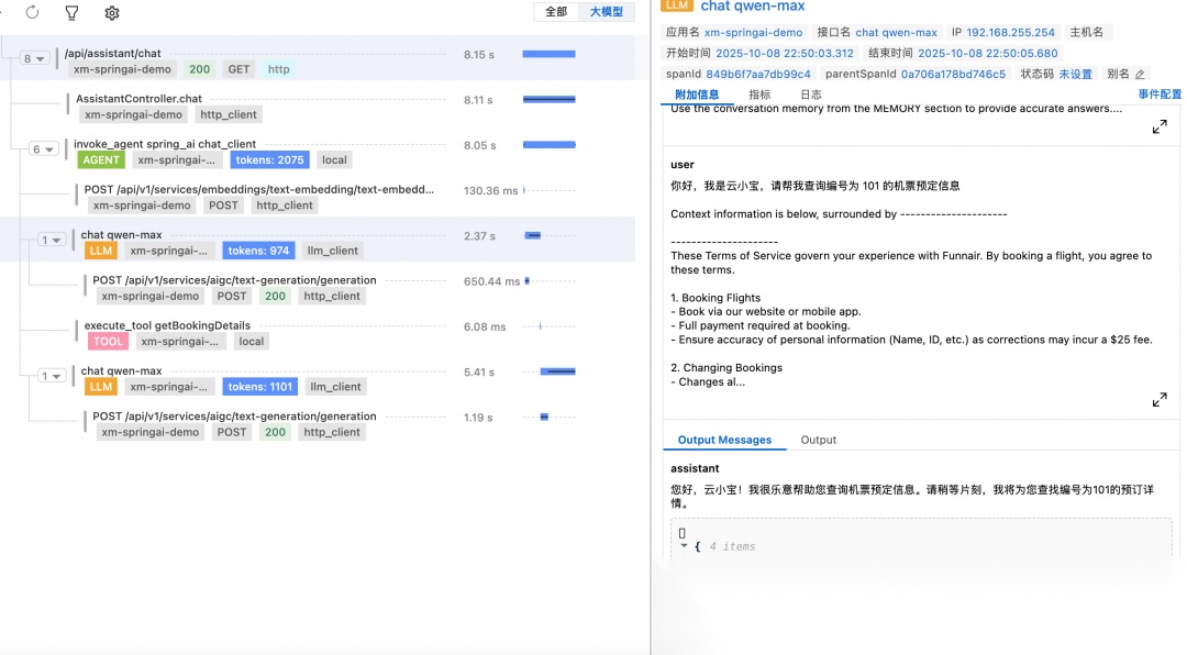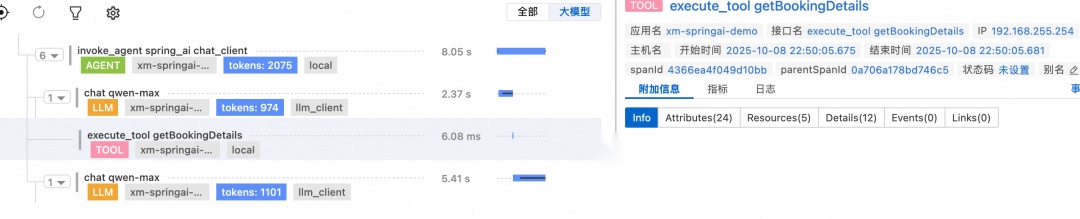 访问应用后,能够查看到大模型的部分调用链路。通过 span 名称可以看到过程中发生了两次大模型调用(chat qwen-max),中间还调用了一次工具(execute_tool get-booking-details),在每个 span 中都可以看到对应的上下文信息,如模型输入输出、消耗 token 数、调用的工具名与入参等等。