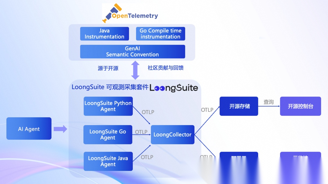 LoongSuite 是阿里云可观测团队维护的一个可观测性开源品牌,统一管理多个数据采集产品。它包含 LoongCollector,用于主机级别的数据采集,支持日志、Prometheus 指标及 eBPF 网络与安全数据。同时,LoongSuite 提供多种语言的进程探针,如 Python、Go 和 Java 探针,用于无侵入式地采集 AI 应用的运行数据。这些探针可以捕获模型输入输出、工具调用情况及耗时等信息。LoongCollector 负责数据的统一处理与上报,支持 OTLP 协议,可对接开源系统如 Jaeger、Elasticsearch,也可连接云厂商的托管服务。此外,LoongSuite 与 OpenTelemetry 社区紧密合作,其 Python 探针基于社区版本扩展 AI 插件,Go Agent 源自阿里云贡献项目,并参与推动 Go 插桩技术发展及 GenAI 语义规范的制定。[17]