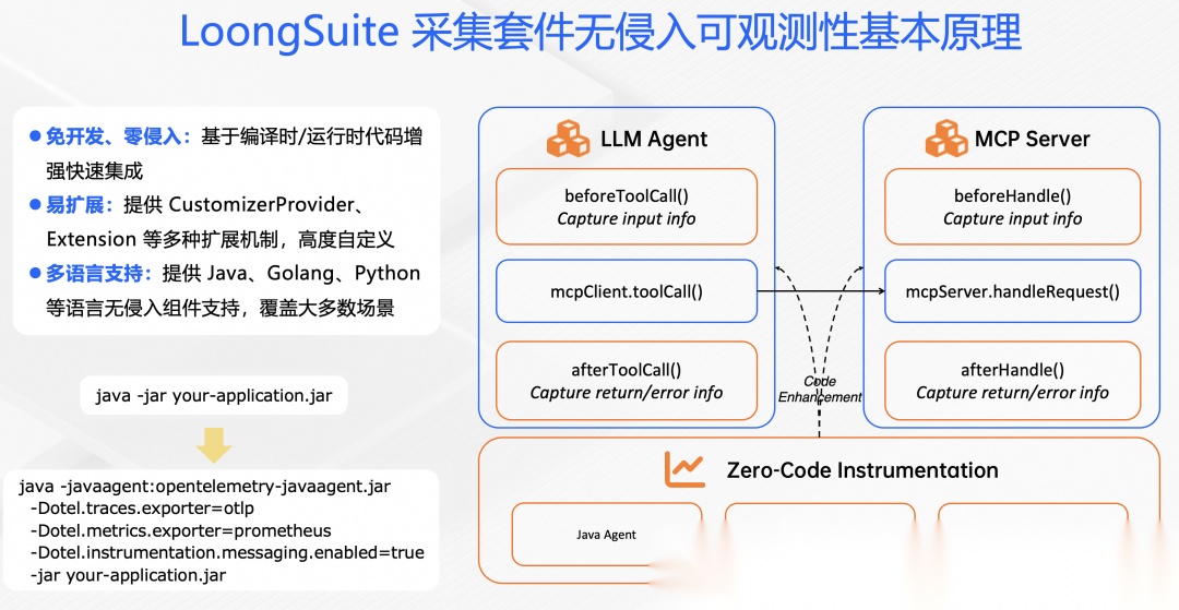 LoongSuite 多语言探针通过 Java、Golang、Python 等语言提供的代码增强机制,在探针包中预定义好一系列的代码增强逻辑。通过修改编译或者启动命令,探针包中的代码增强逻辑会生效于目标框架的关键方法中,在方法执行前后分别执行预定义好的一些步骤,如创建/关闭 span、记录 metrics、传递上下文、捕获异常等。使用者不需要修改业务代码,就可以直接集成可观测性。