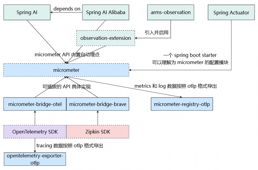 - 数据导出层:Micrometer 在运行时提供可插拔的 Tracer 实现,支持将埋点层产生的数据使用 OpenTelemetry SDK 导出为满足 OTLP 协议的格式;