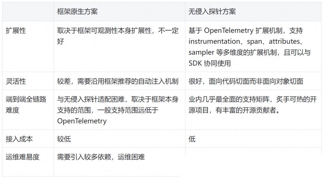 在前言中我们提到,框架原生的可观测性虽然带来了简便的接入体验,但往往存在各种局限性,主要包括以下几个方面: