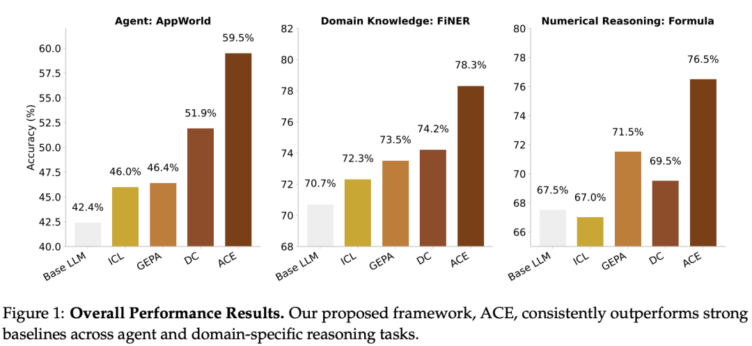 - 创新的框架设计:提出了ACE框架,将上下文重新定义为一部动态演进的“战术手册”,并通过生成器、反思器、策展人的角色分工,模拟了高效的学习过程。