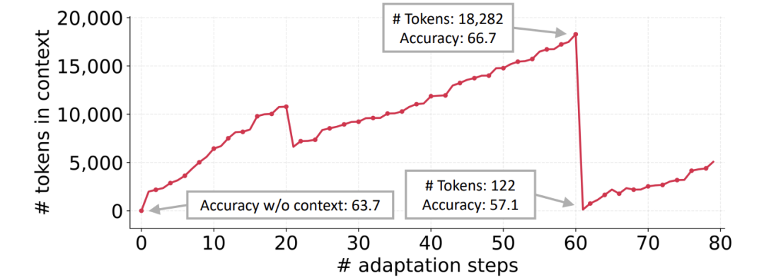 如上图所示,论文中的一个案例显示,在第60步时,上下文包含超过1.8万个令牌,任务准确率达到66.7%。但在下一步,模型将上下文重写为一个仅含122个令牌的极简摘要,准确率瞬间暴跌至57.1%,甚至不如不进行任何优化的基线水平。这种现象就是“上下文崩塌”,它使得模型在迭代学习中“前功尽弃”。
