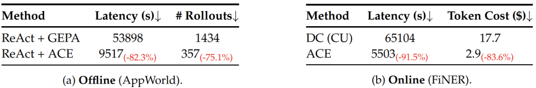 - 在在线优化中,与Dynamic Cheatsheet相比,ACE将**延迟降低了91.5%**,令牌成本降低了83.6%。