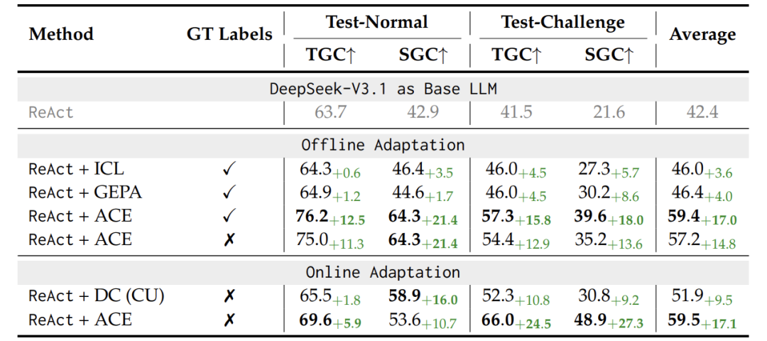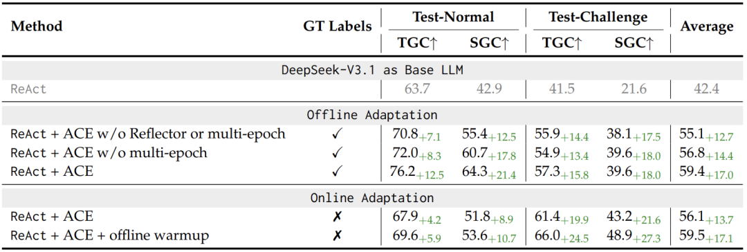 - 这表明,对于需要精确领域知识的任务,ACE能够有效地积累和整理专业知识,形成强大的“战术手册”。