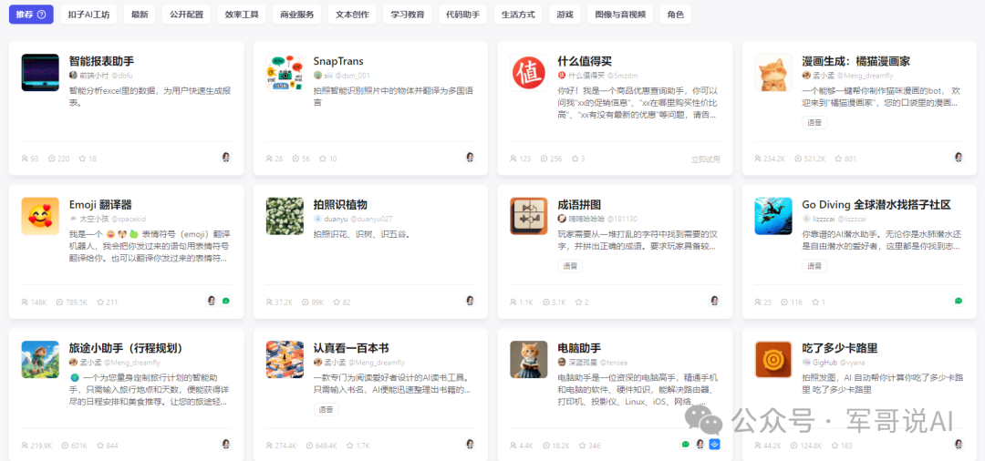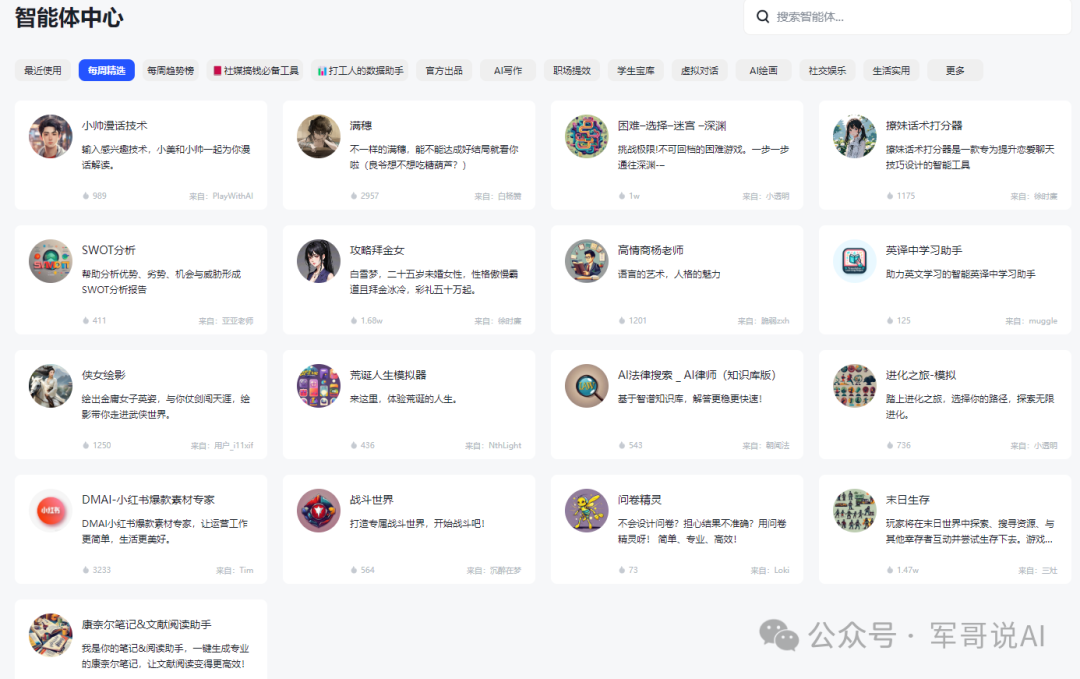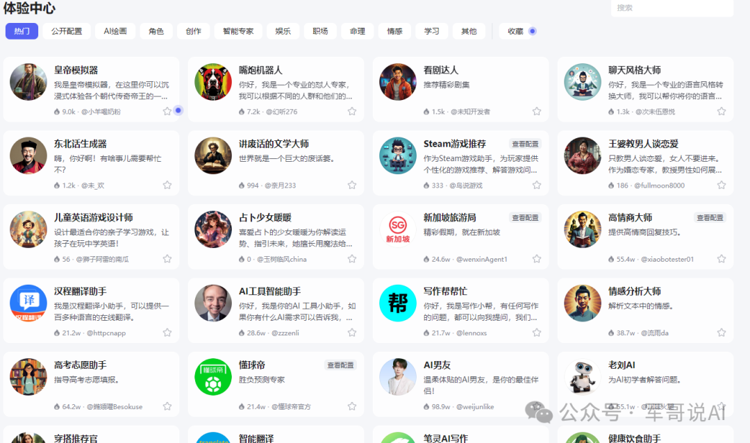 在智能体中心,热门智能体琳琅满目,既有官方精心打造的,也有个人开发者热情贡献的。这些智能体紧贴时事热点,如高考志愿填报助手便是一例,彰显了其高度的实时性和实用性。此外,分类上与其他平台相似,涵盖了工具类(搜索、修图、数据分析等)、娱乐类(搞笑、角色对话)及生活类(搭配选择)等多个领域,满足不同用户的多样化需求。