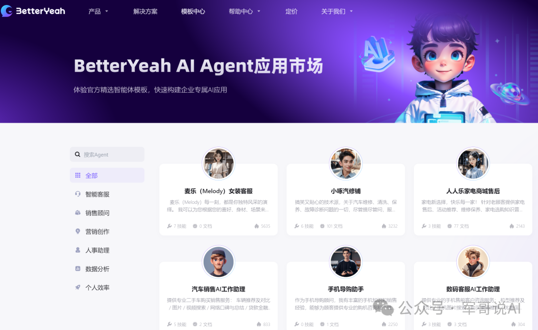 其官方智能体中心更是汇聚了全类别的智能应用,从全面的智能客服系统,到针对电商、销售、营销、HR等多个垂直行业的定制化方案,再到快速上手的学习资源,一应俱全,助力企业轻松实现数字化转型与智能化升级。