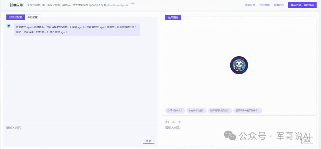 创建智能体新体验:在开源社区中,该产品的智能体创建过程同样令人印象深刻。用户可以通过对话配置和参数配置两种方式,灵活定义智能体的行为逻辑和外观样式。虽然当前版本暂未直接展示workflow流程设计界面,但凭借其强大的功能集成和易用性设计,我们相信未来版本中将会引入更多高级功能,包括workflow流程编辑器等,以进一步提升用户的开发体验和智能体的智能化水平。