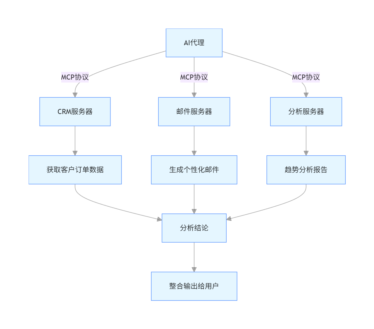 - MCP 作用:代理通过 MCP 调用 CRM API,获取客户信息或更新订单状态。