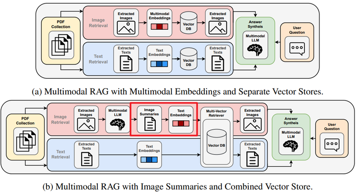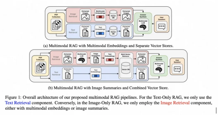 接着作者构建了一个多模态RAG系统(两种配置),将文本和图像结合到一块儿。