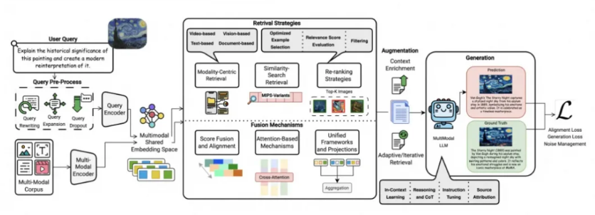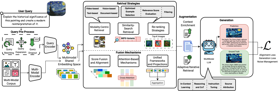 多模态RAG步骤: 查询预处理、多模态数据库、检索策略(模态为中心)、融合机制、增强技术、生成阶段、训练策略。