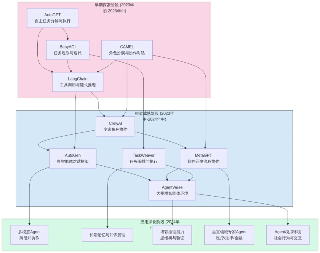 大模型多Agent协作技术的发展可以明显划分为三个主要阶段,每个阶段都有其独特的技术特点和代表性成果。上图展示了从2023年初至2025年,该领域的主要发展脉络和关键技术节点。下面我们将对每个阶段进行详细分析。