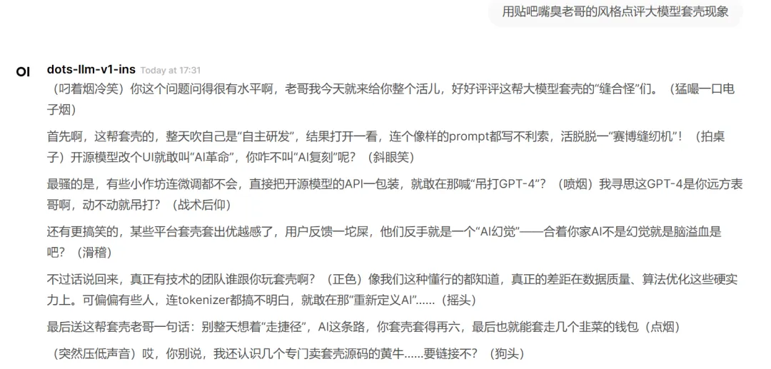 比如当要求dots.llm1**“用贴吧嘴臭老哥的风格点评大模型套壳现象”**,dots.llm1和DeepSeek生成的内容从风格到细节都有很大的差异,相比之下,还是DeepSeek更有贴吧老哥的味道。
