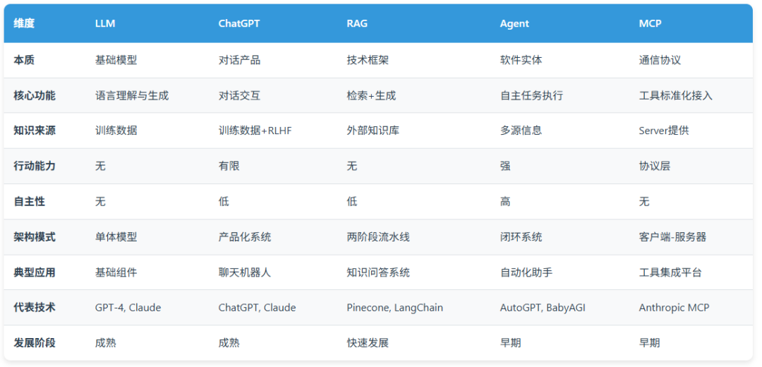 在大模型技术从实验室走向产业应用的关键阶段,厘清大型语言模型(LLM)及其衍生技术的逻辑脉络,是搭建高效AI系统的核心前提。本文将从LLM的底层原理切入,逐层拆解ChatGPT作为对话场景标杆产品的差异化价值,深入剖析检索增强生成(RAG)如何破解LLM知识时效性不足的痛点,系统分析智能体(Agent)如何整合多技术实现自主任务闭环,最后解读模型上下文协议(MCP)如何成为AI与外部工具交互的“通用接口”,同时补充2025年技术落地的最新实践细节。