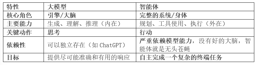- 赋能关系:大模型是智能体的“智慧源泉”——没有大模型的推理与规划能力,智能体只能按固定规则执行简单任务(如“每天9点发送天气提醒”),无法处理复杂、开放的任务(如“根据本周市场动态制定促销方案”);
