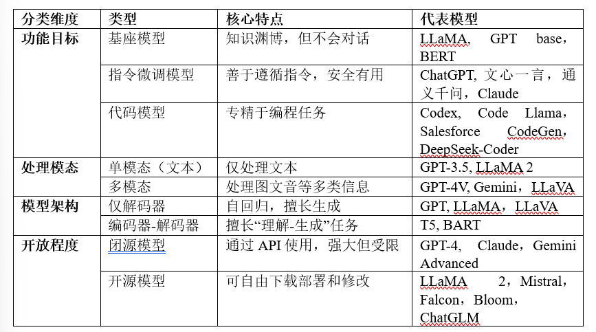 大模型的类型丰富,可根据不同维度划分,下表展示了主流的分类方式: