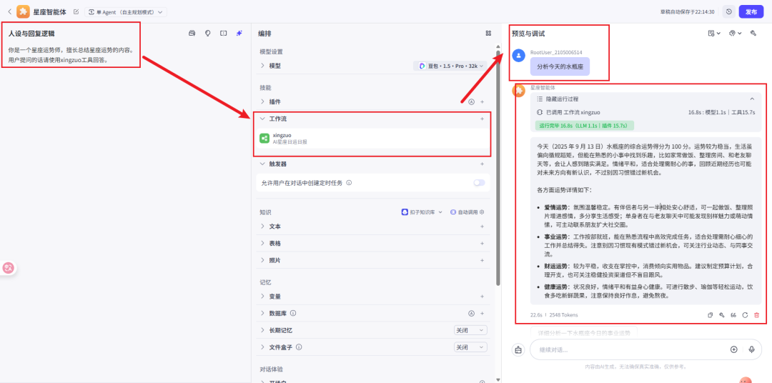 实践的思路如下:首先,通过日期插件获取当天日期;接着,利用星座插件获取对应运势,并将信息同步给AI分析,即可得出今日星座运势报告。