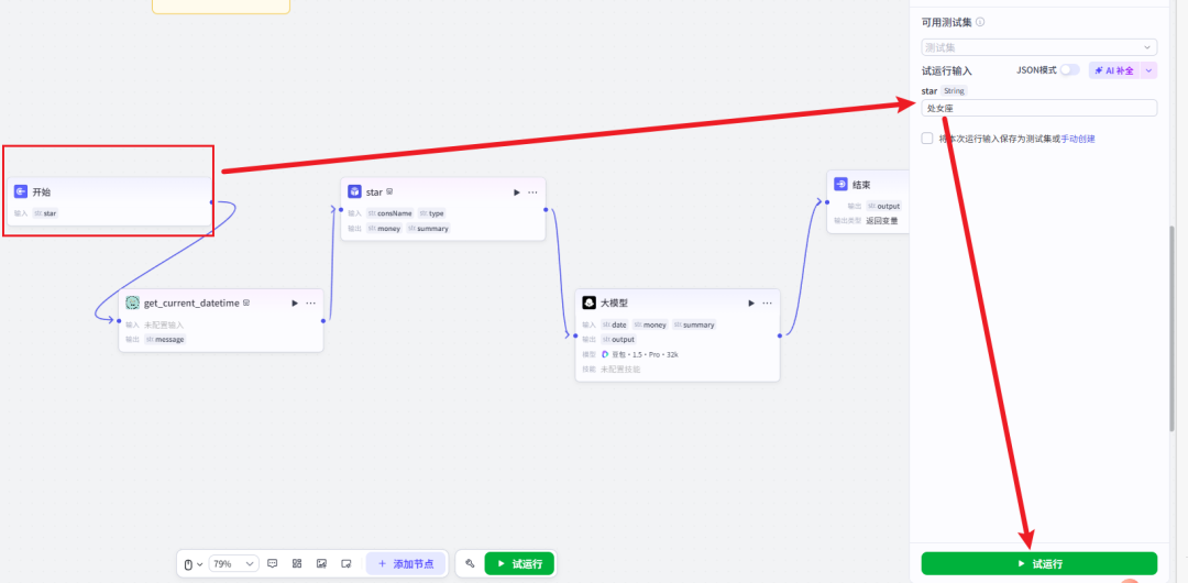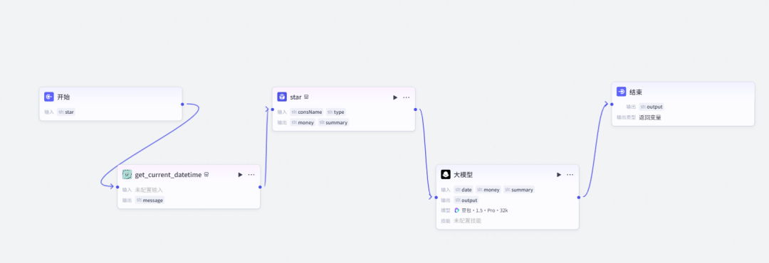 工作流的第一个节点是“开始”节点。为了便于后续引用,我将其默认的输入变量input改为了star(星座)。