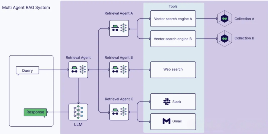 以示例架构为例:核心检索 Agent 负责协调下级三个专用 Agent 获取信息 ——Agent A 从内部专有数据源检索,Agent B 专注网络搜索获取外部信息,Agent C 从个人账户提取数据。