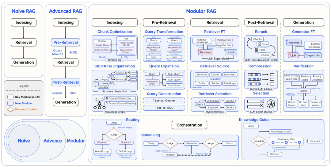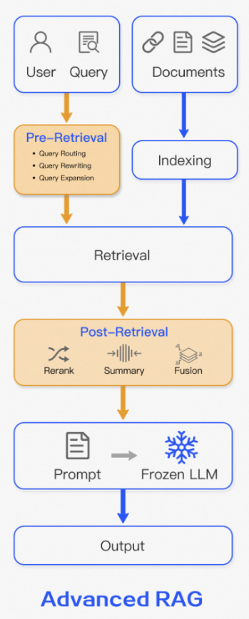 从Naive RAG到Adavanced RAG,主要在 检索前 和 检索后 两个阶段进行优化,