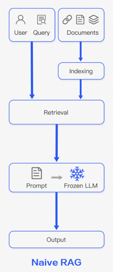 Naive RAG是最底层的RAG架构,后续衍生出的一系列框架都基于此。其核心思想是通过将用户输入查询与知识库中的文档块(chunks)进行匹配,检索到相关内容后连同用户输入与提示词直接输入到大模型中总结并生成答案。