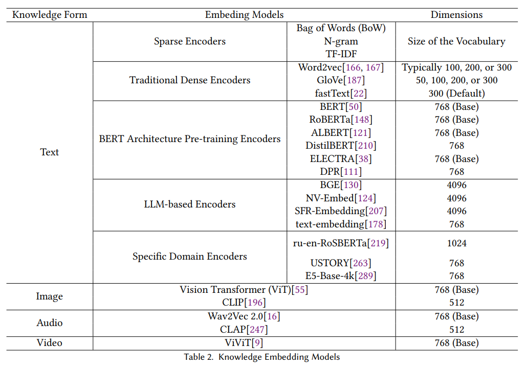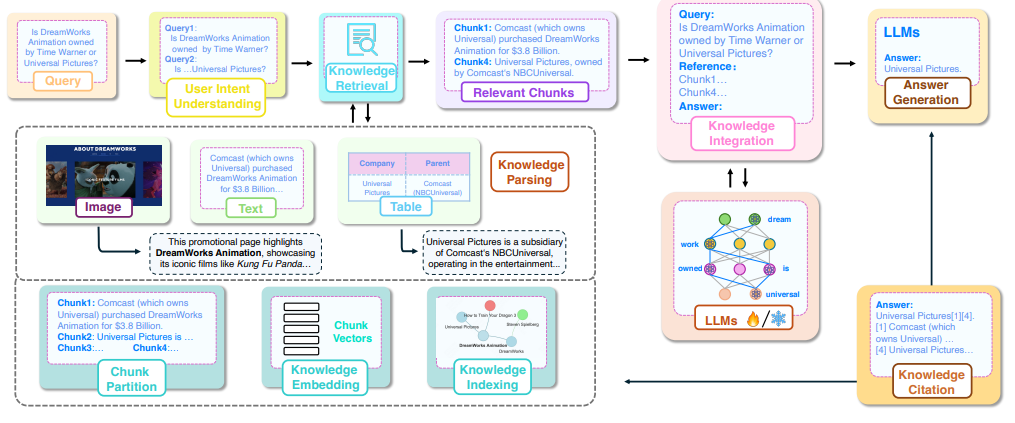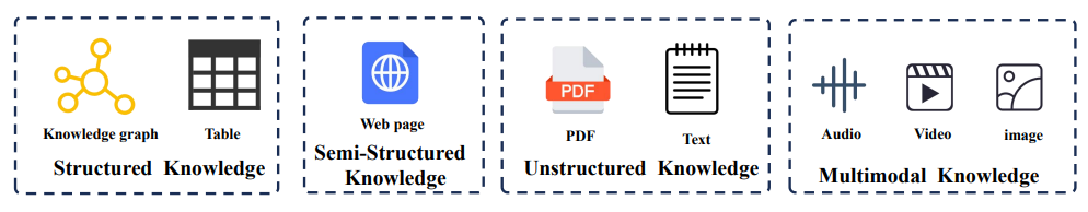 RAG可以利用的知识类型多种多样,为LLM提供了丰富的上下文信息。所使用的知识类别,包括结构化、半结构化、非结构化和多模态知识,以及它们各自的解析和整合方法。