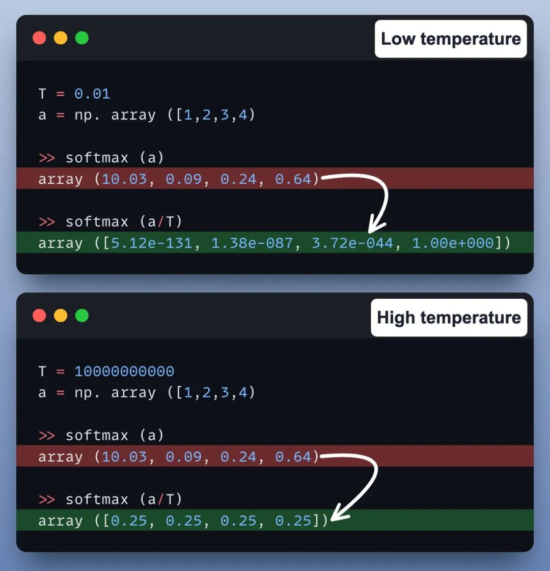 所以,在 softmax 函数中,温度引入了一些调整,反过来这种调整又影响了采样过程。