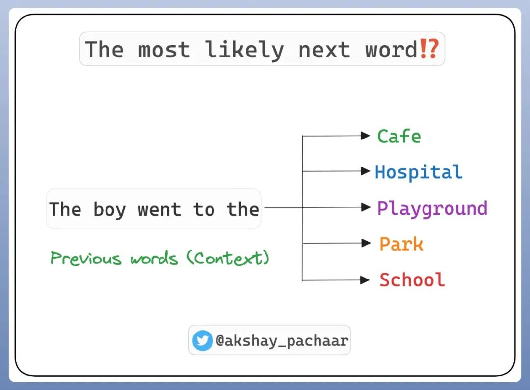 上下文是“The boy went to the“,下一个单词可能是“Cafe、Hospital、Playground、Park、School“,这几个单独对应的概率是“0.1、0.05、0.4、0.15、0.3“。