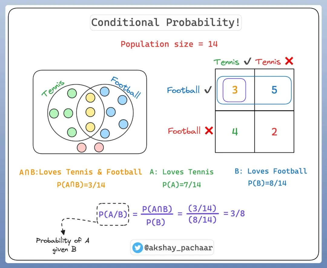 所以,如果要计算一个人在喜欢足球的情况下,还喜欢网球的概率,计算方法为 P(A|B)=P(A∩B)/P(B)=(3/14)/(8/14)=3/8。